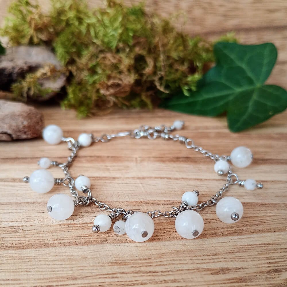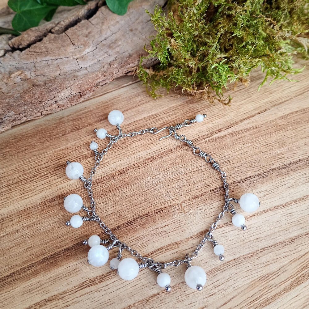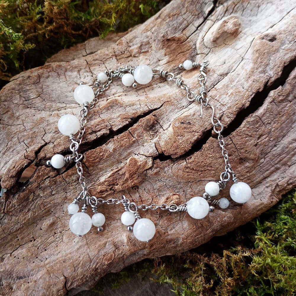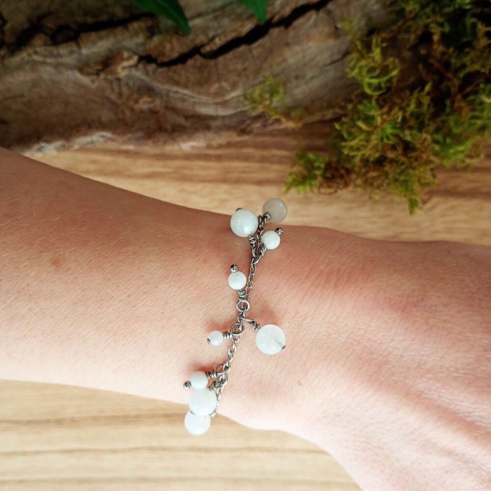 Composé exclusivement de pierre de lune, ce bijou évoque la légèreté et la poésie des flocons de neige dansant dans la lumière du soir. Chaque pierre a été soigneusement sélectionnée puis montée de manière à créer un effet aérien et lumineux venant habiller votre poignet d’une blancheur douce et apaisante.