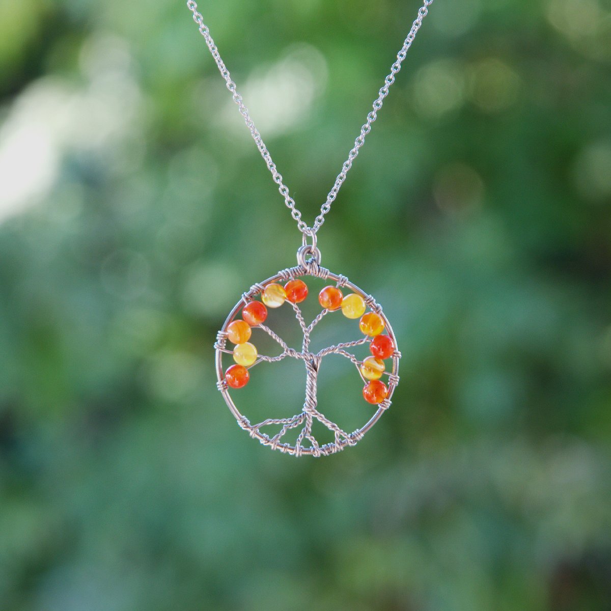 Ce collier met en lumière un arbre de vie orné de cornaline. Le pendentif est fait main avec la technique du wire wrapping. Il mesure environ 3 cm et repose sur une chaîne de 45 cm en acier inoxydable 316L, aussi appelé acier chirurgical, hypoallergénique et résistante.
