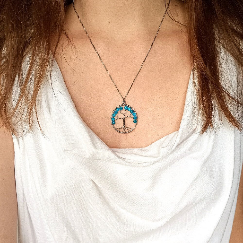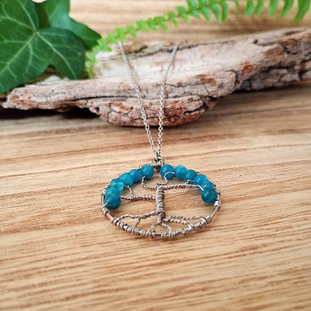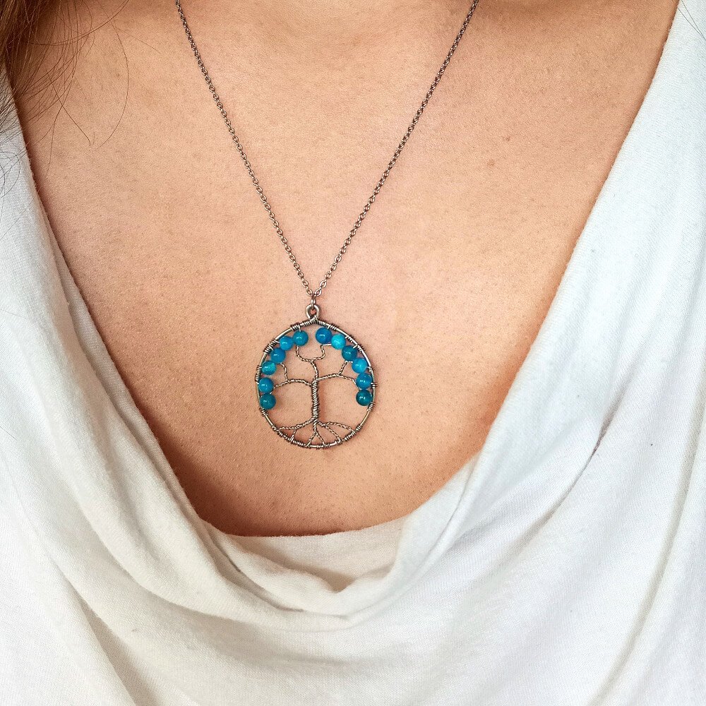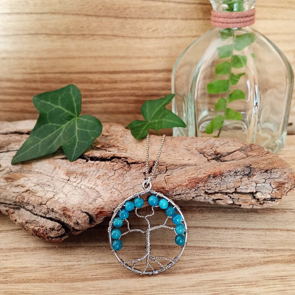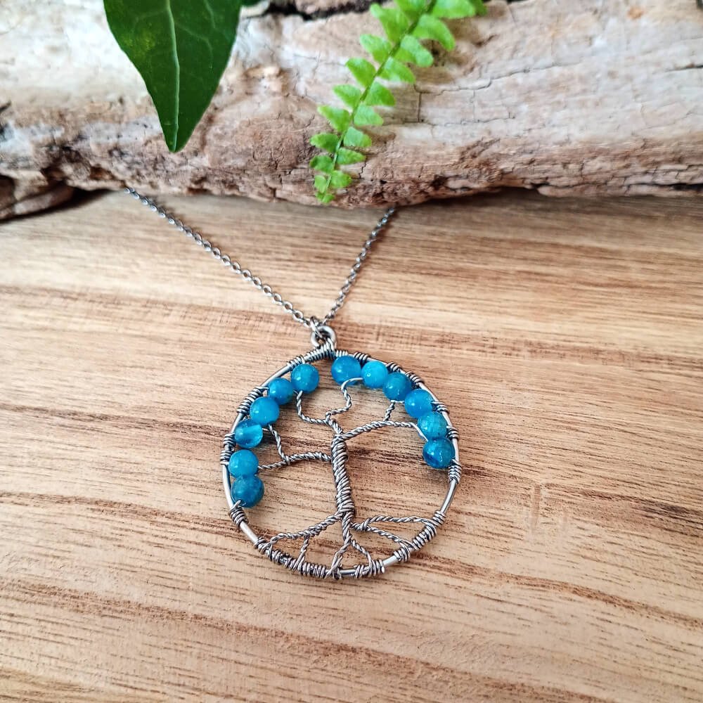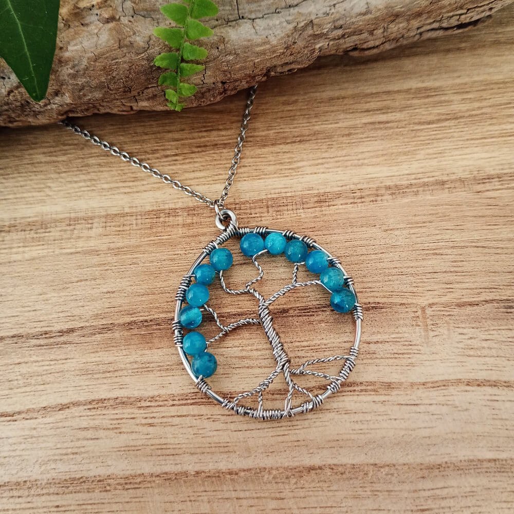 Ce pendentif arbre de vie a été entièrement réalisées par mes soins, à la main, avec la technique du wire wrapping. Il est orné d’apatites, une pierre fine aux magnifiques nuances de bleu. Mesurant environ 3 cm de diamètre, il est monté sur une chaîne de 45 cm.